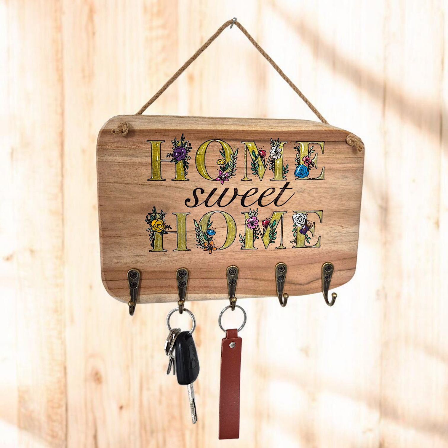 En bois de manguier, très léger, gravé, peint et laqué haute résistance. Crochets en métal.Dimension environ 25x19 cmLa taille et la forme du plareau sont variables